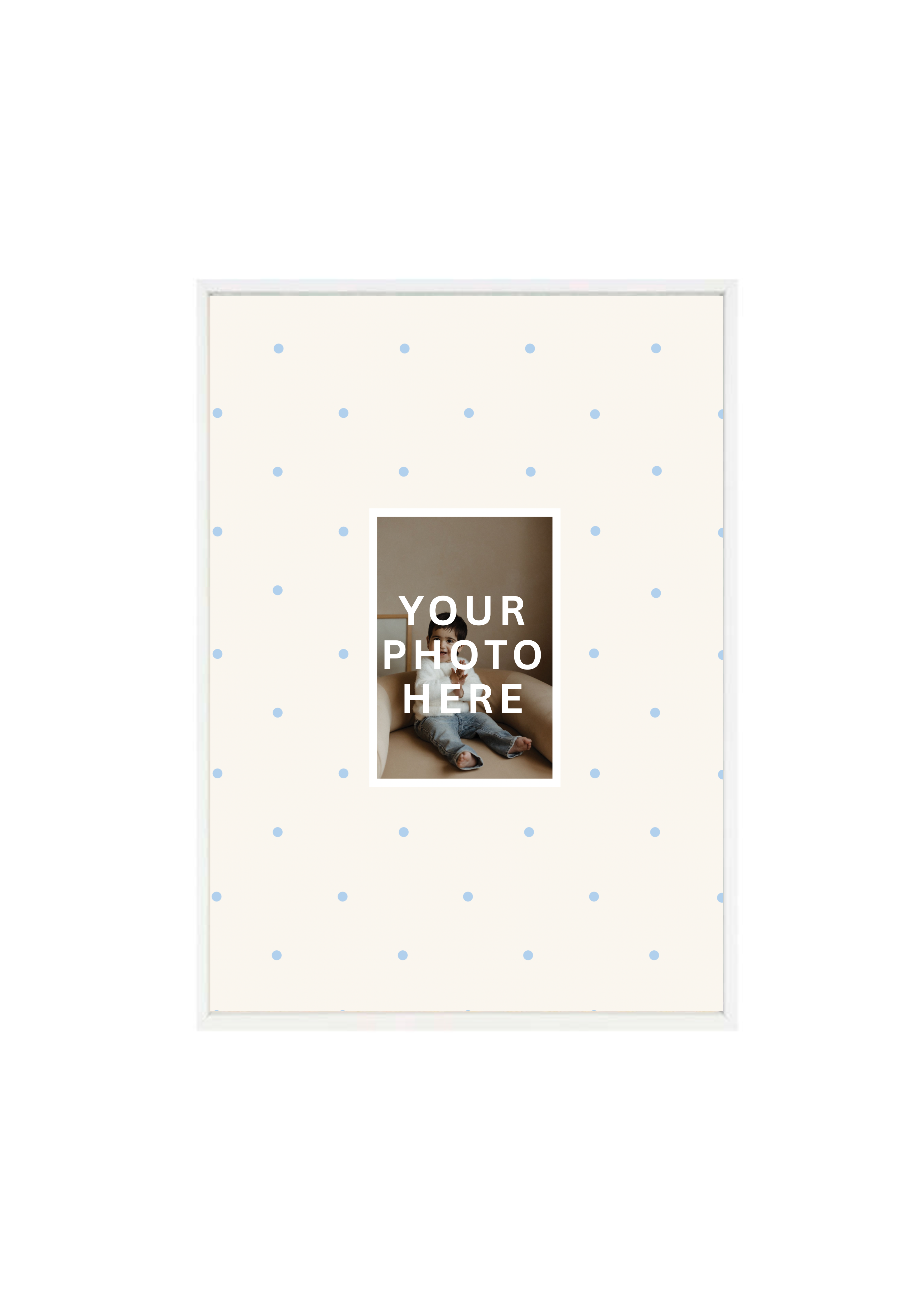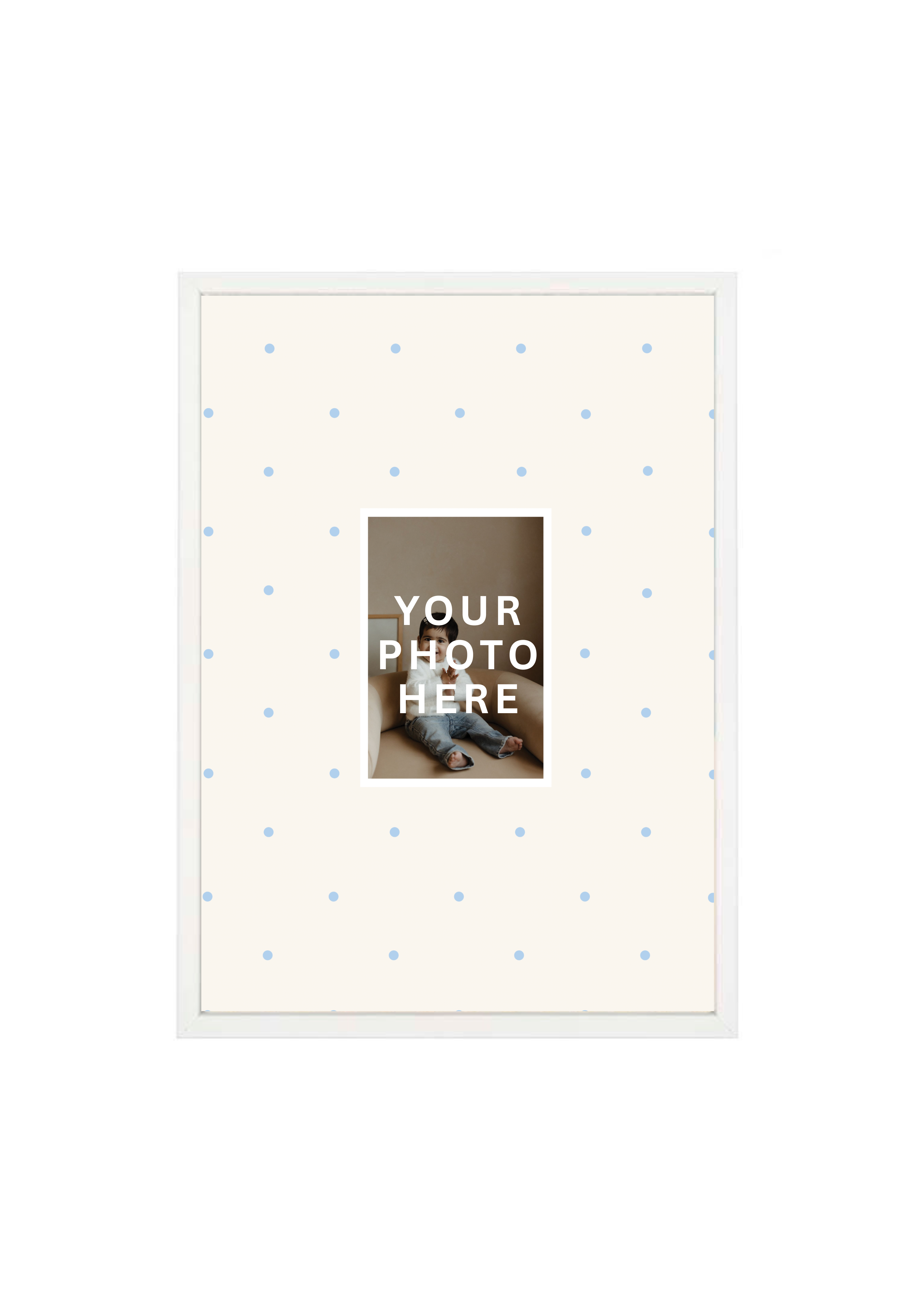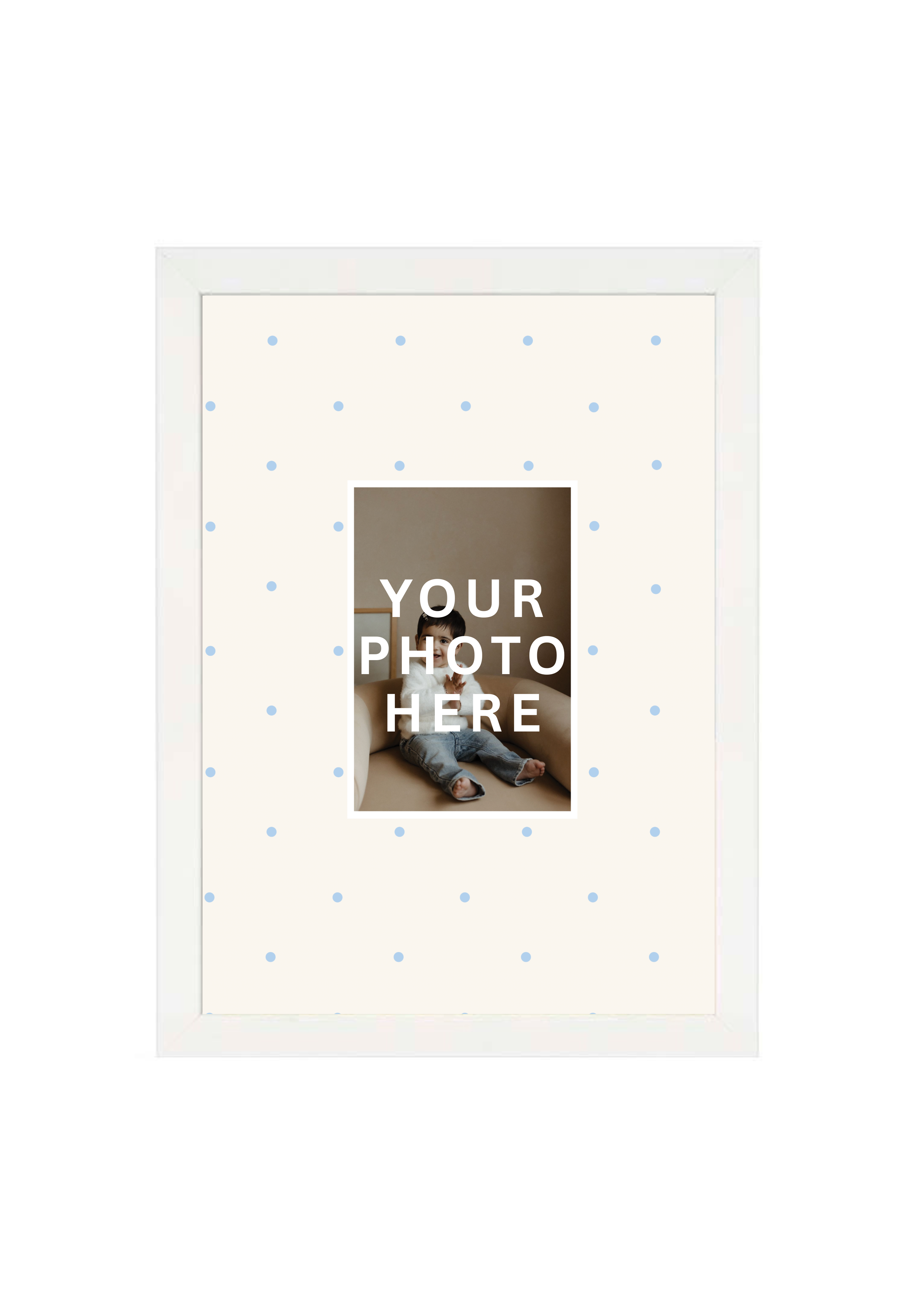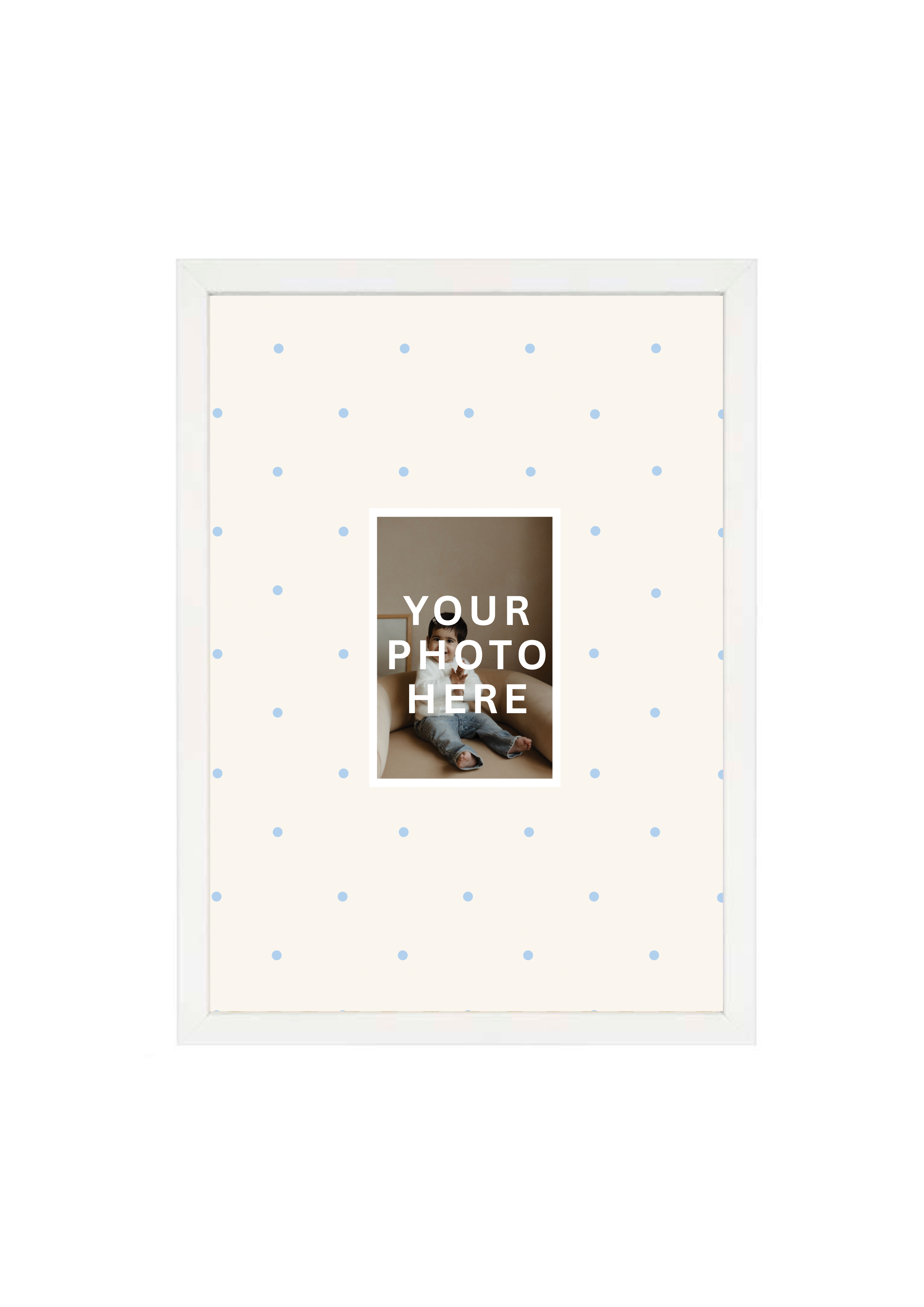 Our Polka Dot Photo Mat in Frost captures the elegance of simplicity subtle blue dots scattered across a neutral base, creating a refined backdrop for your most treasured photos.