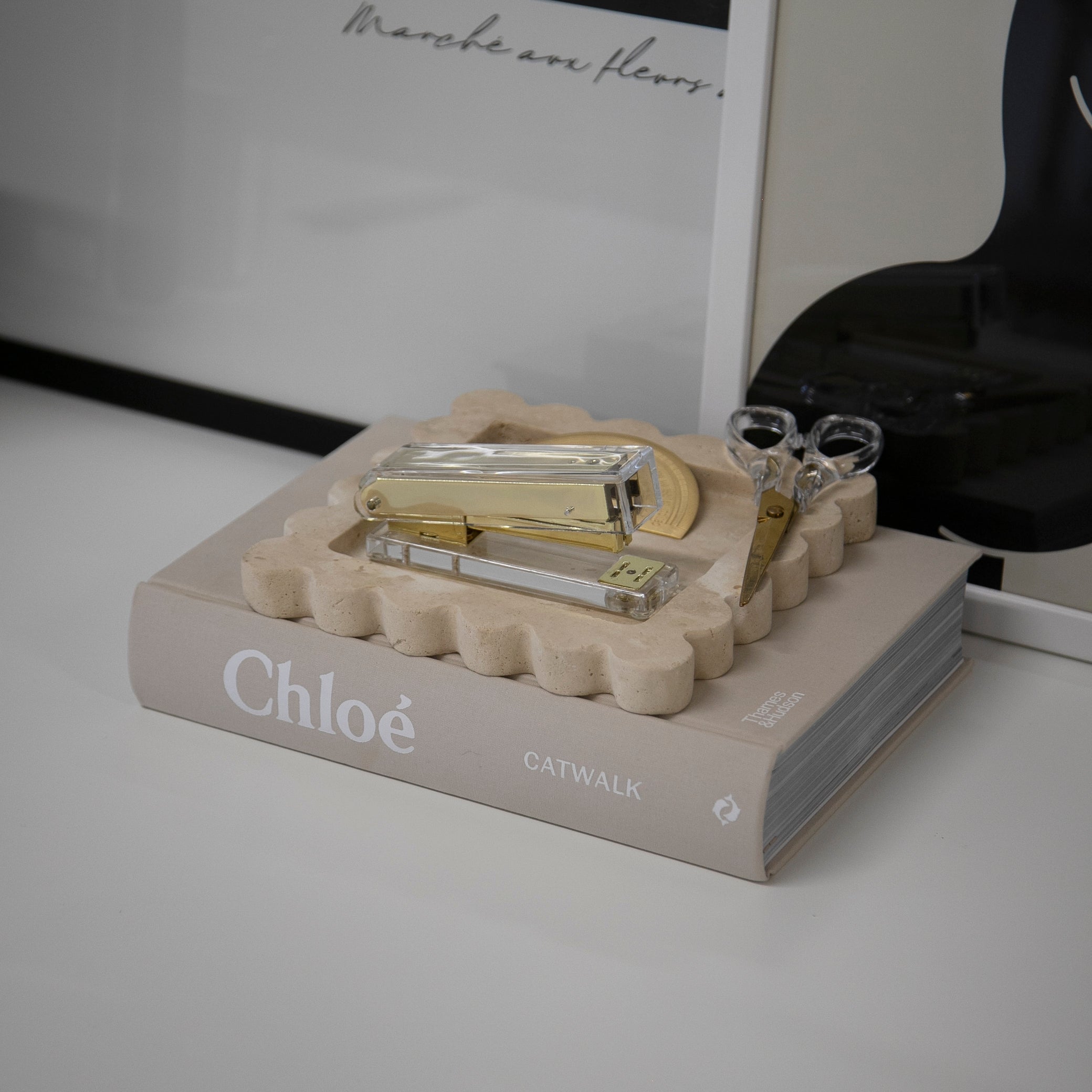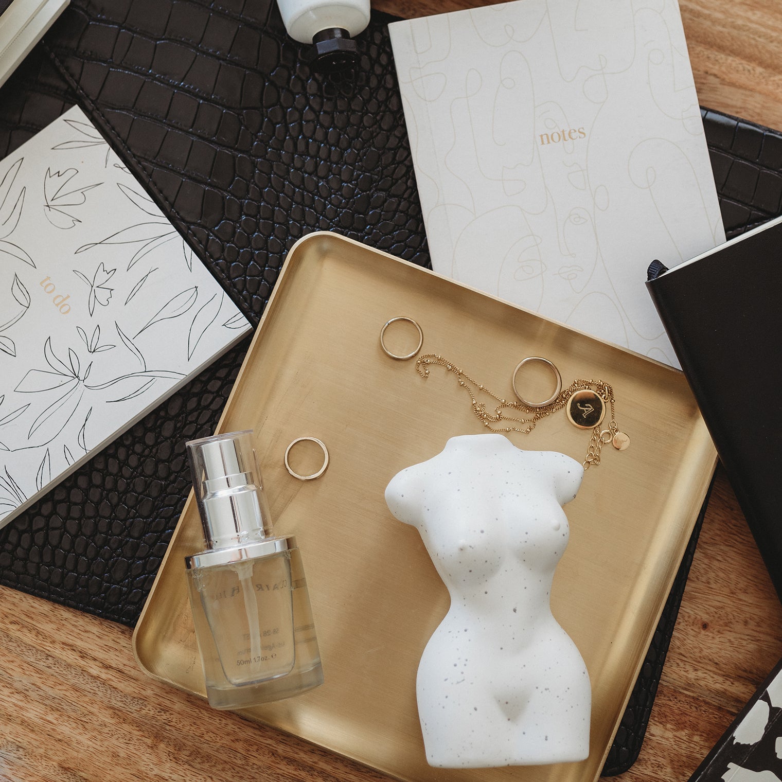 A quietly luxe desk edit in nude, gold and clear; considered pieces that look styled in a minute and get used every day.